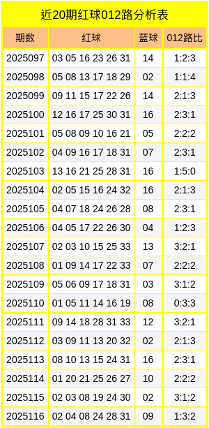 双色球第2025116期开奖,红球:02、04、08、24、28、31,蓝球:09。其中红球012路比为1:3:2,蓝球开出0路号码。