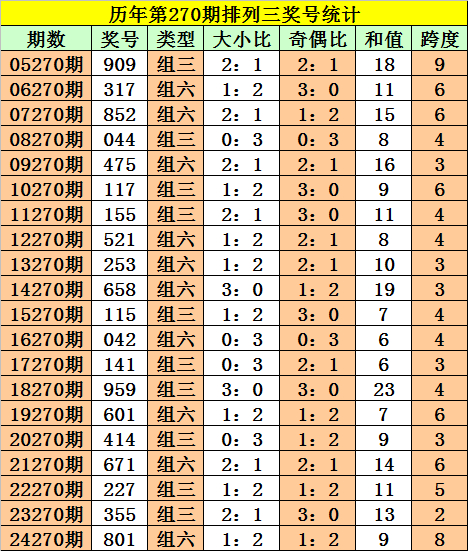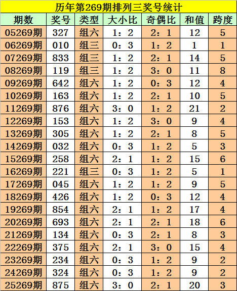 历年第270期奖号中:组三开出10次,组六开出10次。组六出现频次较低,本期重防组六。