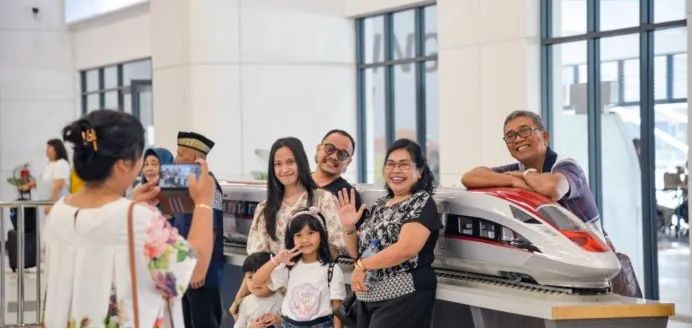 印尼雅加达哈利姆站候车大厅,当地民众和雅万高铁动车组模型合影。