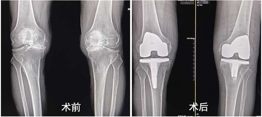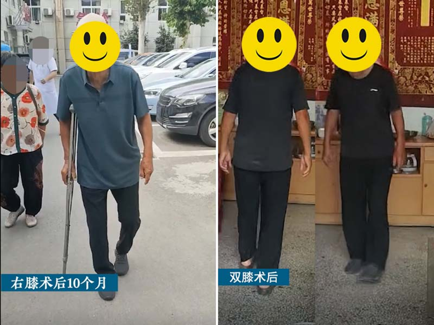 在医生团队的默契配合下,不到一个小时顺利完成了右侧膝关节置换手术。术后祝大爷明显感觉自己的关节功能得到恢复,原本弯曲变形的膝关节变直了,在康复师的帮助下,祝大爷积极进行康复锻炼,术后第一天成功下地行走,术后三天康复出院。经过一年的恢复,祝大爷又进行了左侧的全膝关节置换,恢复良好。